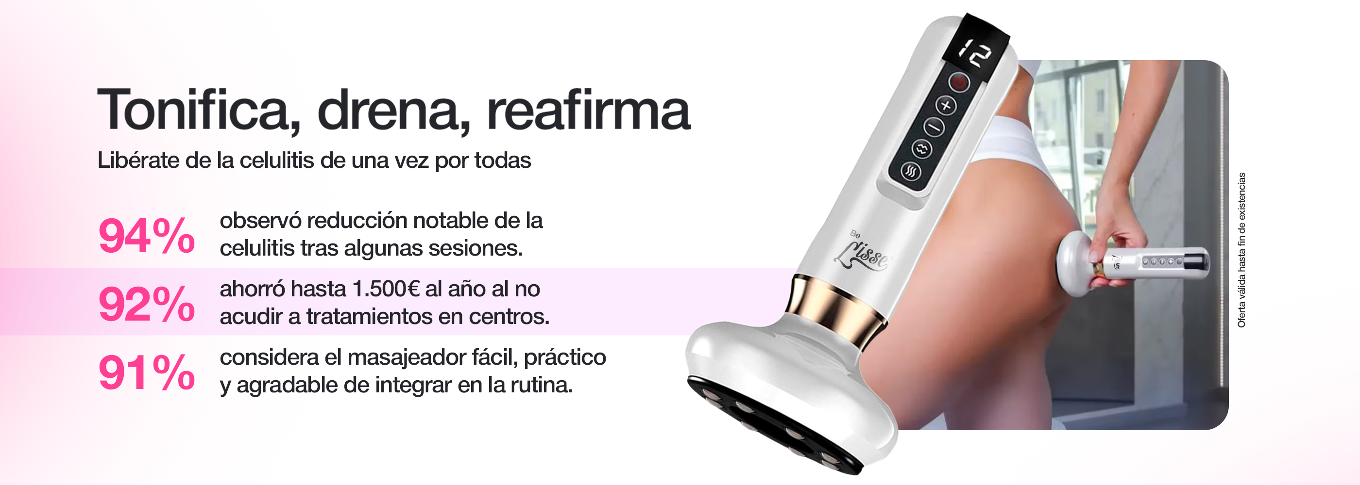“Después de solo 3 semanas de uso, mi celulitis prácticamente ha desaparecido y noto una mejora visible en todo el cuerpo: piel más suave, tejidos más firmes y una sensación general de ligereza.